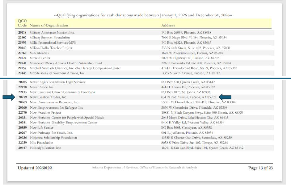 New Creation Trades is an Arizona 501(c)(3) Corporation which is certified as a Qualifying Charitable Organization.
